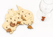 Never lose track of your glass again with this charming timber set featuring iconic Australian animals, beautifully presented on a timber Australia map.